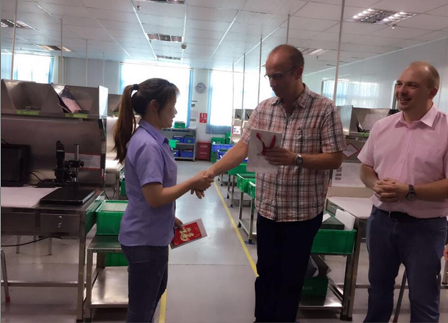 客戶審核團代表德國品質(zhì)體系經(jīng)理、中國辦事處品質(zhì)負責(zé)人等共同出席了本次頒獎儀式,現(xiàn)場為我司FQC檢驗員李燕同志頒發(fā)了禮品、獎金及“優(yōu)秀檢驗員”的榮譽證書。